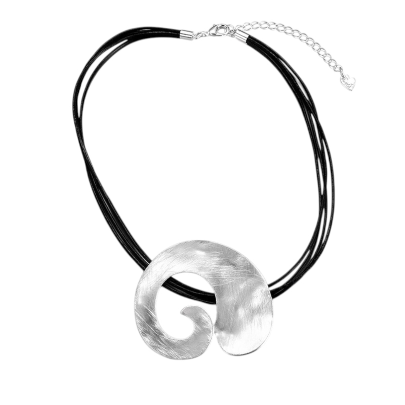 Deze spiraalketting is een bijzonder sieraad die direct opvalt door zijn artistieke vormgeving.De grote zilverkleurige hanger heeft een elegante vorm die symbool staat voor beweging en
