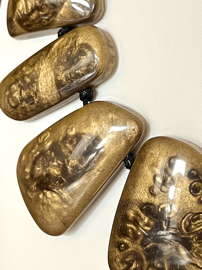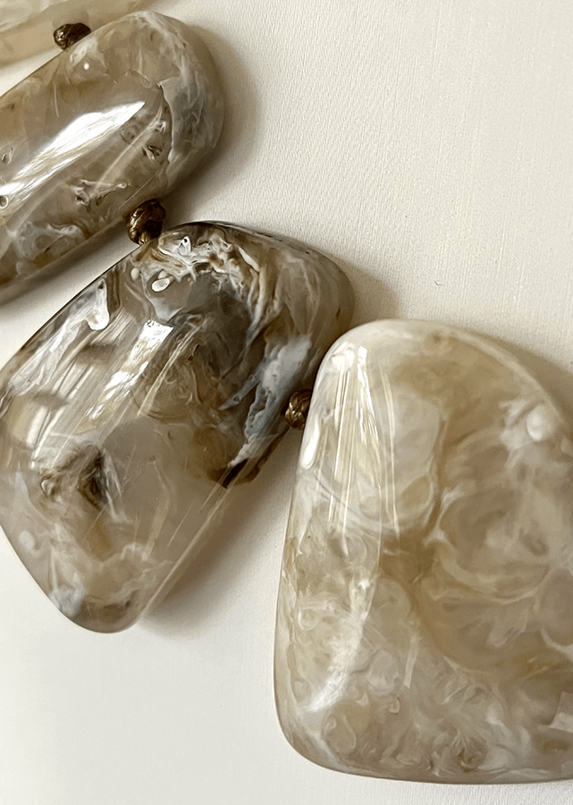 De ketting Atria is een opvallend accessoire dat meteen de aandacht trekt. Het ontwerp bestaatuit grove, organische gevormde kralen die doen denkena an natuurstenen met een bijzondere